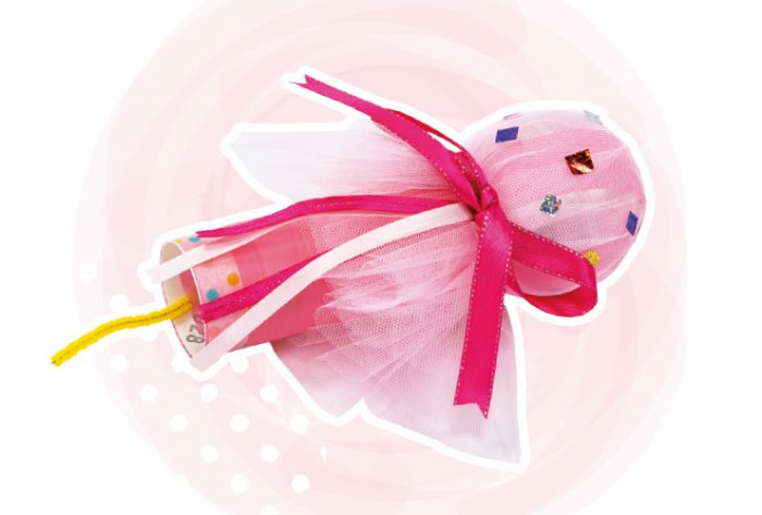 チュールとリボンがかわいいマイクはアイドルにぴったり! 丸い部分はおもちゃのカプセル。中にビーズを入れれば、踊るたびに音がして、もっと楽しい!