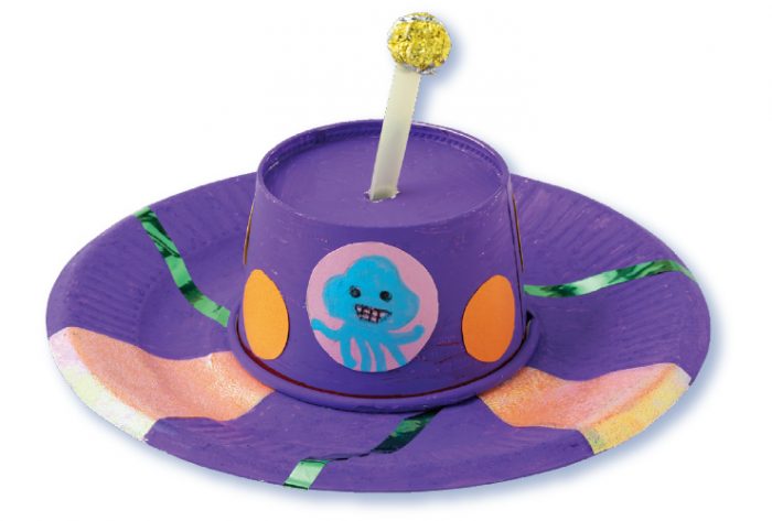 紙皿とアイスなどの空き容器を組み合わせてUFO形のこまに。自由に飾りつけてオリジナルのUFOを作って。