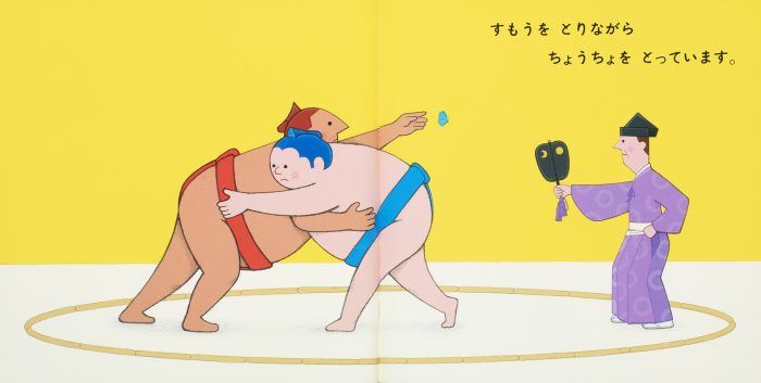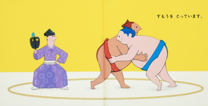 おすもうさんが すもうを 「とっています」。