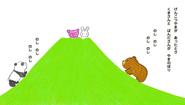 歌詞に登場する「げんこつやま」で、動物たちが山登り。