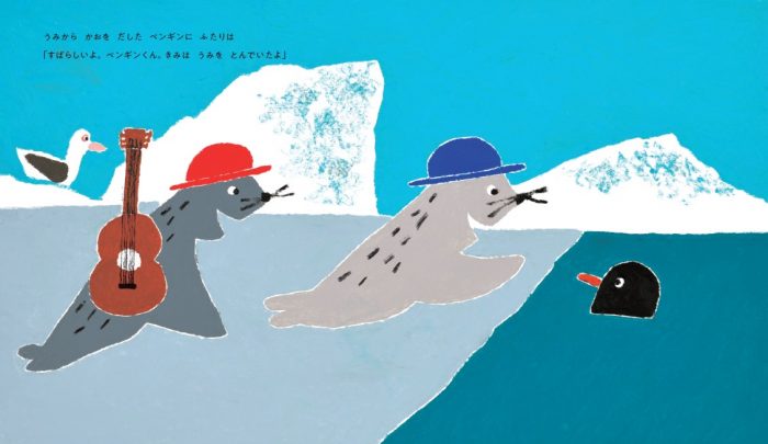 「鳥なのに、翼はあるのに、空を飛べない」落ち込むペンギンを励ますのは、2頭のアザラシのきょうだいです。「きみは海を泳げるじゃないか」「きみたちみたいに泳げる鳥なんて、いやしないよ」。あたたかい声に勇気をもらったペンギンは、海に飛び込みます。