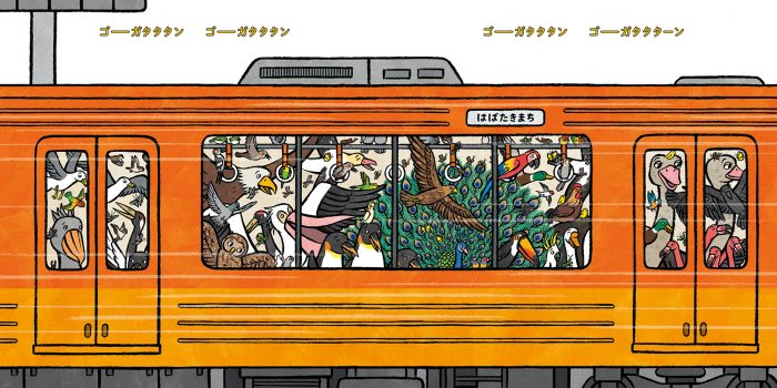カバーの裏⾯は、絵本に登場する不思議ないきものたちの電⾞ポスターになっています。⿃たちが乗っている「パタパタ