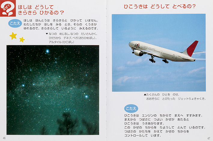 ワンダーの幼稚園・保育園向けの教材のコンテンツを活用し、機内用お子様向けオリジナルポケット図鑑を制作しました。『なつのずかん』は、夏の自然(昆虫、草花、海の生き物、野菜、果物)に加え、空や雲、天気の読み物や、機体のラインナップをもりこむ等、空の旅ならではのコンテンツも充実させました。親子連れが増える夏休みシーズンを中心に、搭乗したお子様に配布するノベルティとして活用いただきました。機内だけでなく、飛行機を降りてからも旅の思い出とともに親子で楽しめる図鑑で好評をいただきました。(2003年~2007年まで毎年実施実績) |