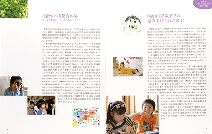 著者二人が伝えたい保育メソッド「保育の哲学と実践」を現場の目線で書き映し、第1章から4章までの構成の中で、0歳児から5歳児・就学前までの発達過程を見据えた保育や「5つの教育」を観点とした保育をテーマごとに分析。年間プログラムや月プロジェクトや指導計画案などの実践例の紹介と、カメラマン塩﨑由美子氏による撮りおろし写真が数多く掲載されたことで、より現場のリアル感が伝えられ、こどもの未来や現代の保育者へのメッセージがたくさん込められています。日本の保育メソッドを世界に発信する一冊となりました。 |