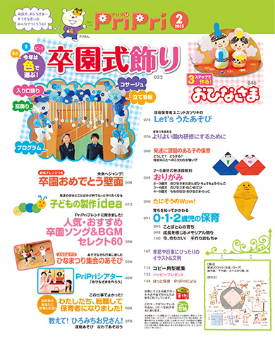 みんなの胸にじ~んと響く卒園ソング&BGMセレクトもおすすめ! また簡単3ステップでできる「おひなさま」特集も、由来から製作・子どもの製作を生かした飾り方提案まで充実の内容で見逃せません! そのほか大好評連載とともに、今月もさらに魅力度の増した「保育に役立つ!」アイデアをお届けします!