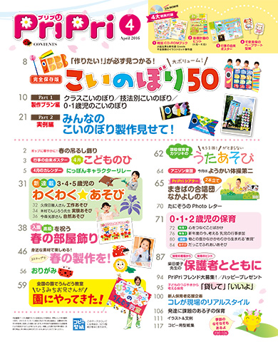 あそびページでは、わくわくあそびで人気の久保田雅人さんや、実験でおなじみ米村でんじろう先生をはじめとする豪華著者陣が登場☆4月に必ず作るこいのぼりは、どの保育雑誌よりも多い50プランを紹介します。大人気の部屋飾りや製作をはじめ、子どもと保護者に焦点を当てた連載や、発達に課題のある子の保育、012歳児の保育など、保育を深めるページももちろん充実です。
