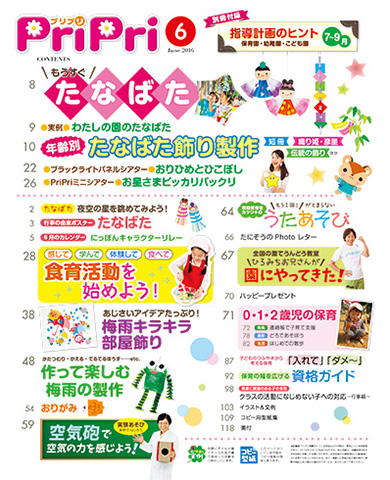 梅雨を迎え、緑が濃くなると、クラスの活動もぐっと活発になってきますね。今号の「たなばた特集」は、子どもたちの「作りたい!」に応えるべく、さまざまな「切る」「貼る」「描く」で作れる製作を取り揃えました。笹を彩りながら、伝統を感じたり、願い事を考えたり、心も豊かになる活動となりますように。あそびコーナーでは、米村でんじろう先生が段ボールで作れる空気砲をご紹介。ほかにも、梅雨にぴったりの「季節の製作」や「保育の幅を広げる 資格ガイド」など、保育が一段と広がるヒントをお届けします♪