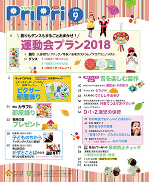 園の一大行事!運動会。今号では、入退場門や看板といった「飾り」と、年齢別の「ダンス」をご紹介します。なかでもイチオシは、大人気・千金美穂さんキャラクターによる海賊船の入退場門☆また、秋の行事・敬老の日のコーナーも。子どもの手の温もりが感じられるメッセージカードやスマホスタンドを、おじいちゃん、おばあちゃんへ贈りませんか?