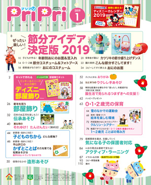 今月は、ディズニーカレンダー2019が付録されます。記念日やなぞなぞも入っているので、保育室で大活躍間違いなし!節分の特集は、鬼のお面や豆入れはもちろん、フォトブースやダンスなど、盛り上がるプランが満載!さらに、マイナス10℃の北海道での雪上運動会ロケの様子も。