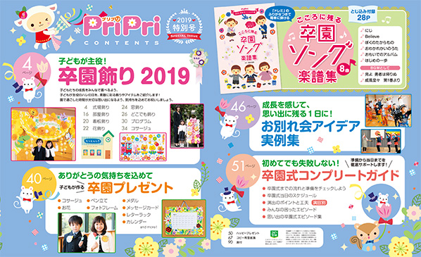 PriPri2019年特別号は卒園式準備特集号です。卒園式大特集!会場飾り・演出・卒園ソング、卒園式の全てがそろいます!PriPriは、保育園・幼稚園・こども園の保育者向け総合誌。全力で保育に役立つアイデアをお届けします。