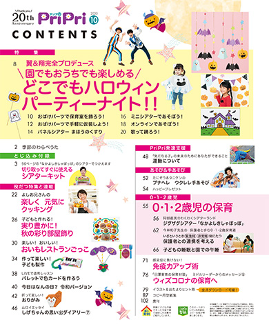 10月号の特集は「園でもおうちでも楽しめる どこでもハロウィンパーティナイト!!」です。オンラインで楽しめる、なぞなぞシアターや、歌とダンス、簡単に作れてハロウィン気分を盛り上げる吊るし飾りなどをご紹介。密を避けながら楽しめる工夫が満載です。もちろん素敵な衣装もたくさん。