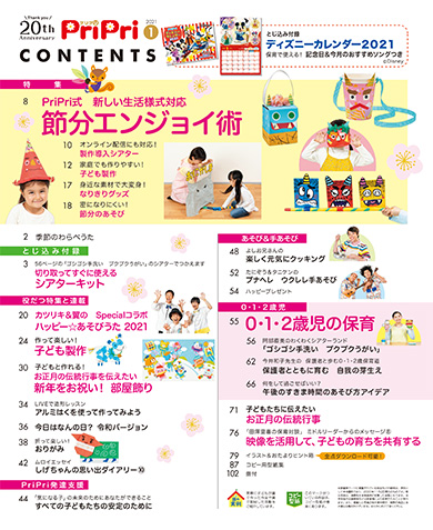 1月号の特集は、新しい生活様式に対応した、節分エンジョイ術。ソーシャルディスタンスを保ちながらあそべるゲームや、マスクを活用した鬼のなりきりグッズなどをご紹介します。