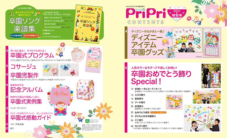 特集では、卒園式を華やかに彩る会場コーディネートや看板飾り、プログラムなどのプランがもりだくさん。子どもの卒園製作のアイデアも充実。卒園ソング楽譜集のとじ込み付録つき。