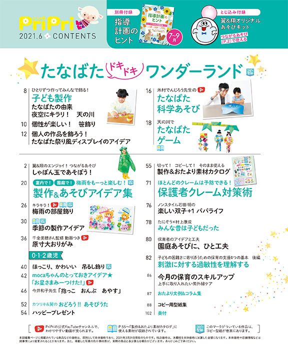 PriPri6月号はあそび、読み物、発達への支援など内容が大充実。特集は「たなばたドキドキワンダーランド」。たなばたの子ども製作のアイデアや、科学あそび、ゲームなどをご紹介しています。また、梅雨の時期ならではの室内でも外でも楽しめるあそびも充実。