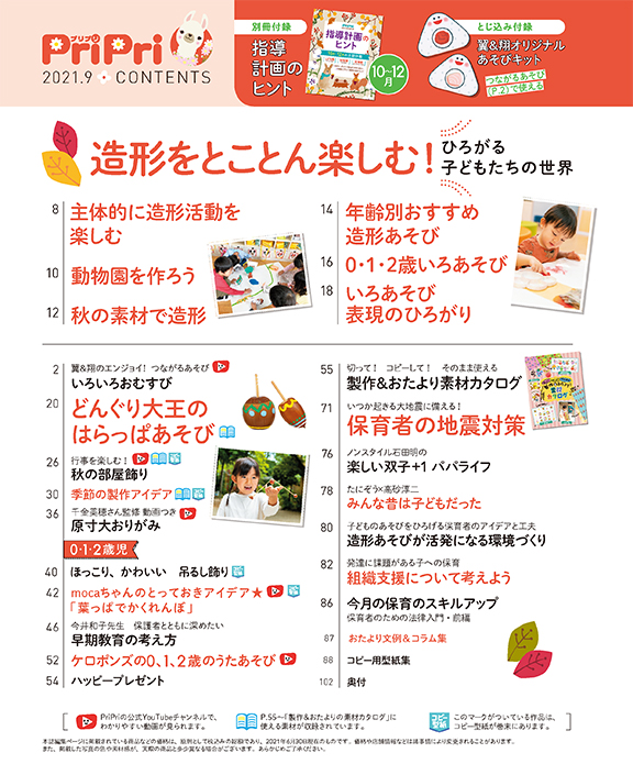 秋に向けて、この時期に取り組みたい「造形活動」と「自然あそび」を特集します。自分の経験を表現する、色の世界であそぶ、など子どもの発達の段階に合わせた造形活動の実例や工夫、取り組み方など造形のヒントがいっぱい。自然の中でどんぐりで楽しむゲームやワイワイ楽しいあそびのアイデアもご紹介しています。