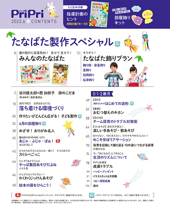 GW明けから取り組みたい「たなばた」は、可愛さバツグンの年齢別製作アイデアと飾り方アイデアはもちろん、製作から集会までの流れを追った園の実例レポートもご紹介しています。