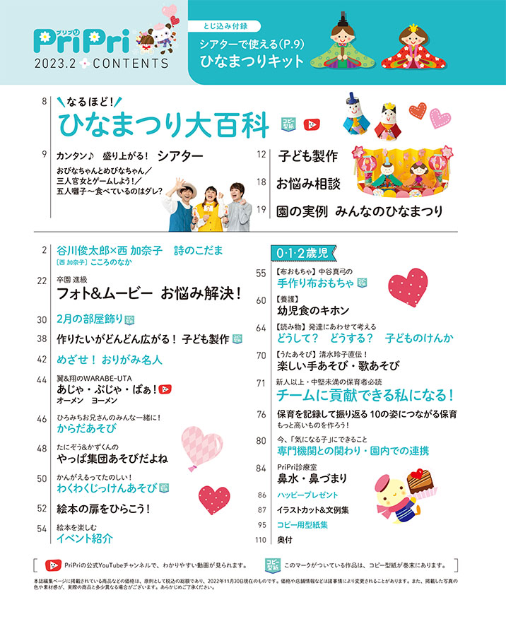 巻頭特集は「なるほど! ひなまつり大百科」。大人気の鈴木翼さん・PriPri初登場のgaagaaSさんによる、行事の由来を楽しく伝えるシアター&ミニゲームや、この時期作りたい子ども製作など、ひなまつりを盛り上げるプランや情報を詰め込みました。