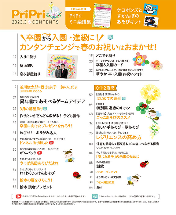 卒園式や新年度準備に役立つページが満載! 新年度まで使える「おめでとう飾り」や「手づくりカード」など、心を込めて旅立ちを見送る制作プランやあそびアイデア、012歳児ならではの進級準備など、充実したラインナップとなっています。子どもたちと楽しく過ごすための保育のヒントをお伝えします!