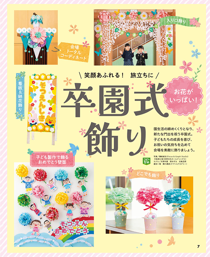 PriPri2023特別号は、卒園式の会場飾り&卒園ソングをぎゅっと詰め込んだ、保存性の高い1冊。卒園式の会場飾りは、トータルコーディネートから、可愛い入口飾り、看板飾り、アクセントになるどこでも飾りなどをラインナップ。さらに、みんなで作りたい子ども製作や、手作りプログラム&コサージュなどのアイデアも満載です。