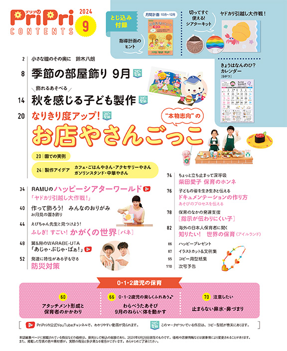 とじ込み付録は毎号人気のシアターキット、「きょうはなんのひ?カレンダー」に加え、10月~12月に役立つ冊子「指導計画のヒント」も。日々の保育にすぐに活用できます!