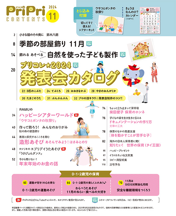 11月号の編集部イチオシ記事はなんといっても「プリコレ」! 子どもたちに親しみのあるお話や歌をメインに、着るだけでカワイイ衣装アイデアを幼児向け・乳児向けでご紹介します。今年の発表会・劇あそび衣装も、PriPriにお任せください♪