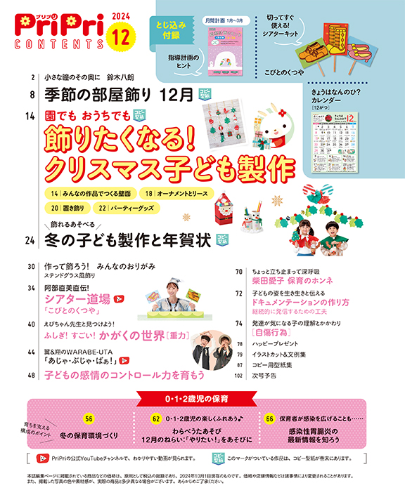 0・1・2歳児特集では、関心の高まる環境設定と感染性胃腸炎について、冬ならではの視点を解説します。そのほか、翼&翔のうたあそび、発達支援連載は「自傷行為」についてと、充実の内容でお届け。
