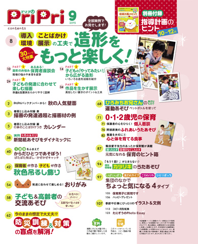 今月の造形特集は、ちょっとした工夫でさらに楽しく広がる造形表現を実例つきで紹介しています。絵の具などの材料に親しむ3歳児、楽しみながら造形に取り組む4歳児、豊かな発想で見事な描画を完成させる5歳児の姿には感動すら覚えます。