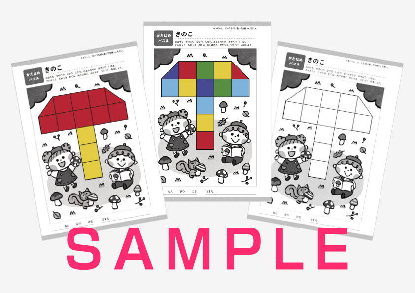 PriPri発達支援パレット2021年秋号「コピーdeすきま時間あそび」内に掲載されている「かたはめパズル」のカラー版ダウンロード素材です。日々の保育にぜひお役立てください。