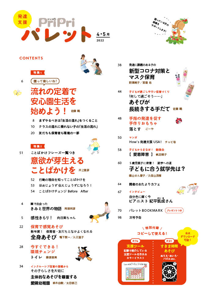 今号では、新年度スタートに合わせ、園生活の“流れ”の定着を支援するアイデアや意欲が芽生えることばかけのポイント、また長引くコロナ禍での新型コロナ対策についても紹介します。