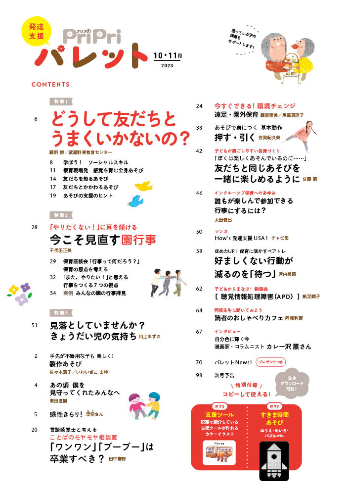 10・11月号の特集は、「どうして友だちとうまくいかないの?」と題して、ソーシャルスキルについて学びます。自分や友達への理解を深められる、感覚あそびのプランが満載。発達障害の子のきょうだい児についての特集では、当事者のリアルな思いも含めて、できることは何なのか?理解を深める手立てをご紹介します。そして大きな行事があるこの時期は、園として見直すチャンス。様々な園の取り組みや園長対談など多角的な視点で考え直していきます。