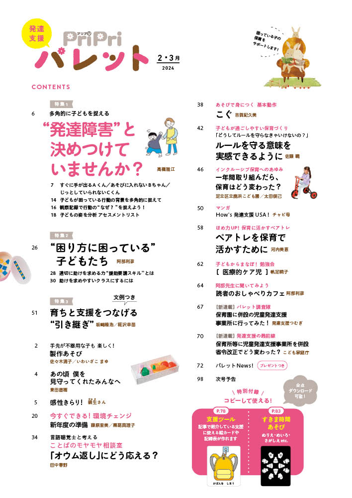 「発達障害かもしれない」というひと言でその子の特性を決めつけていませんか? 幼児期には、愛着の問題や生活習慣、状況への不安が、発達障害にも思える行動につながることがあります。第一特集では、そんな子どもたちの行動を多角的に捉える方法をアセスメントリスト付きで紹介します。第二特集は、困っているときに自分が何に戸惑っているのかを伝える「援助要請スキル」がテーマ。助けを求める力=生きていくために大切な手段を育む方法をお伝えします。他に、引き継ぎ書類の書き方&文例など知っておきたい情報が満載。
