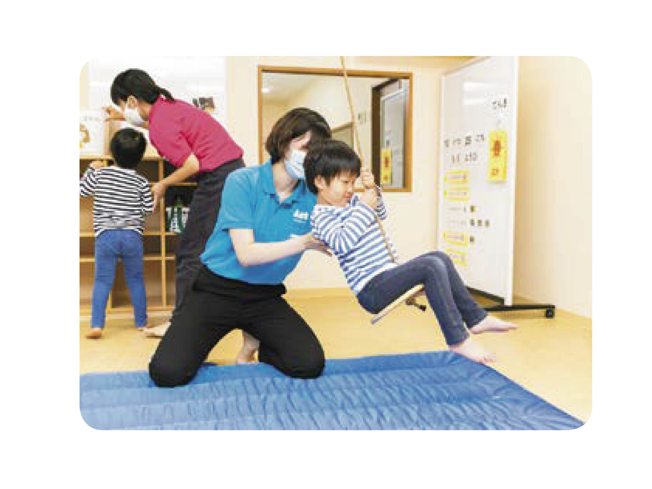 施設により療育内容は異なりますが、ここは「運動療育」が中心です。運動が苦手な子には体の使い方を教え、逆に体を動かすことが好きな子には、存分に動かせる居場所になれればと思っています。プログラムは一人ひとりに合わせて作りますが、トランポリンやはしご、跳び箱などを使った粗大運動に加え、巧緻性を育てる指先を使うあそびなども取り入れます。また、あそびの中で順番を待つ、ルールを守るなどのコミュニケーションスキルも育みます。お子さんの特性や様子に合わせて個別療育かグループ療育かを選べます。