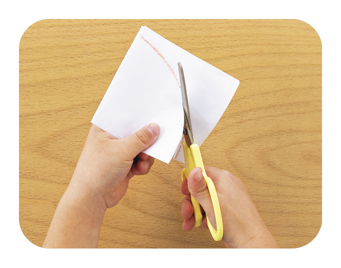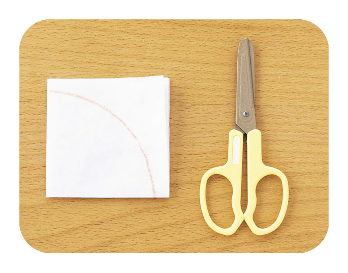 | 1.準備 15cm角の和紙とはさみを用意する。和紙はあらかじめ保育者が2回折り、開くと丸になるように目安線を描いておく。 |