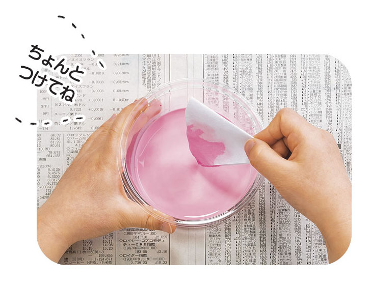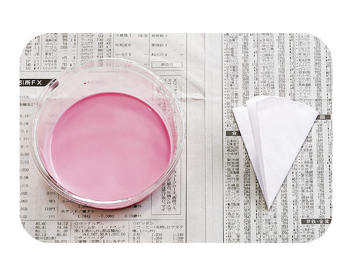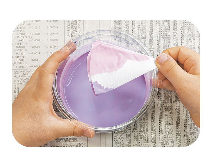 | 6.別の色でもう一度染める 別の色の絵の具をカップに溶いておき、⑤で染めた和紙が乾かないうちにもう一度染める。その後、開いて乾かす。 |