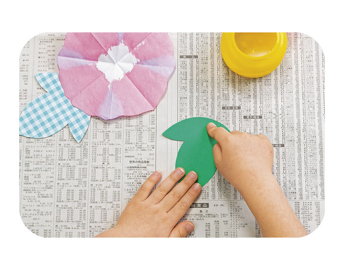| 丸く切った和紙を2色の絵の具で染めて、あさがおに。保育者が和紙を折って、あらかじめ目安線を描いておくと、はさみの取り扱いが苦手な子でも切りやすくなります。 |