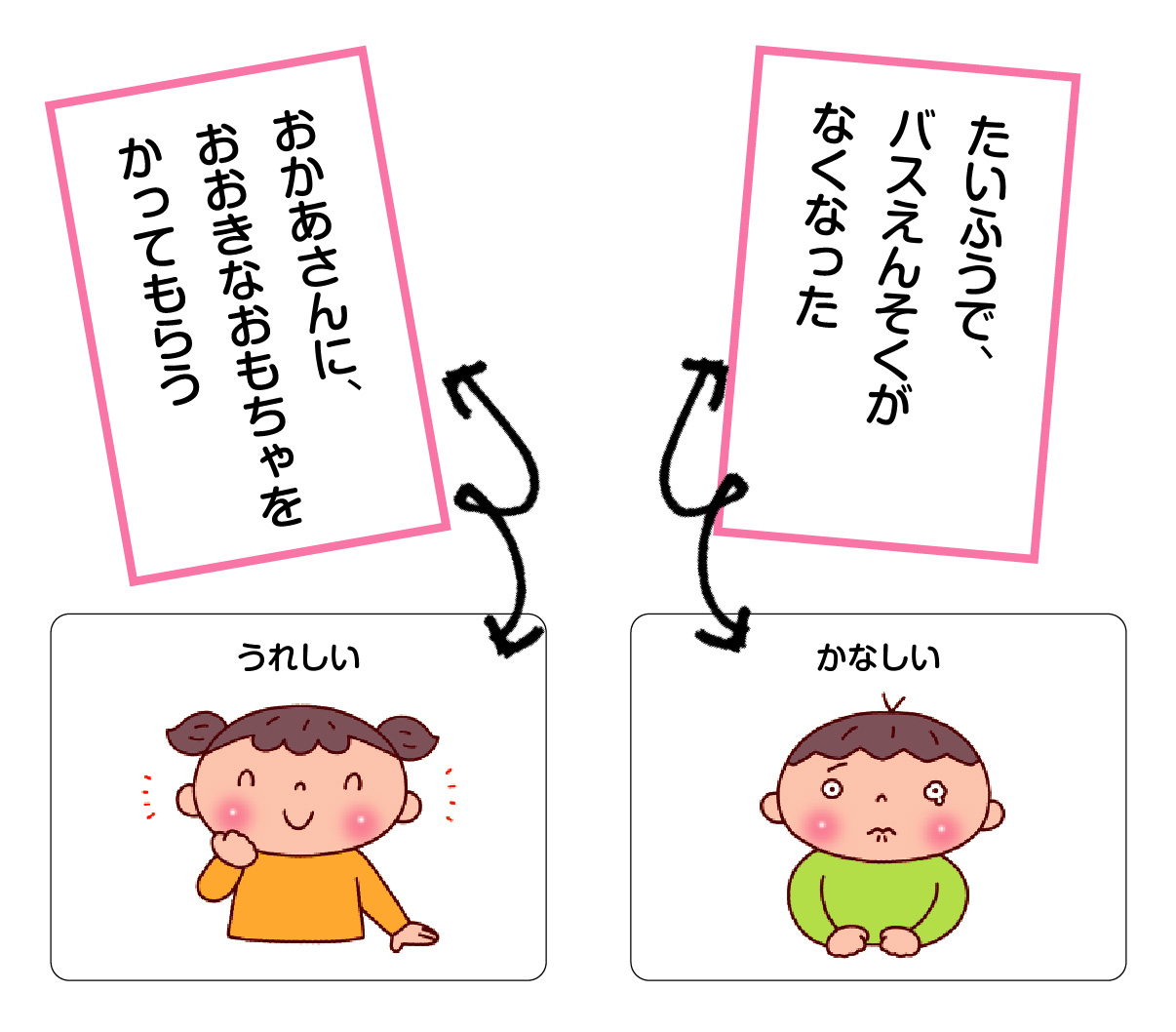 | 1.取り札("気持ち"の絵を描いたカード)と、取り札にある気持ちを連想する文を書いた読み札を作り用意する(子どもが5〜6歳児なら、一緒に文を考えてもいいでしょう)。 | |