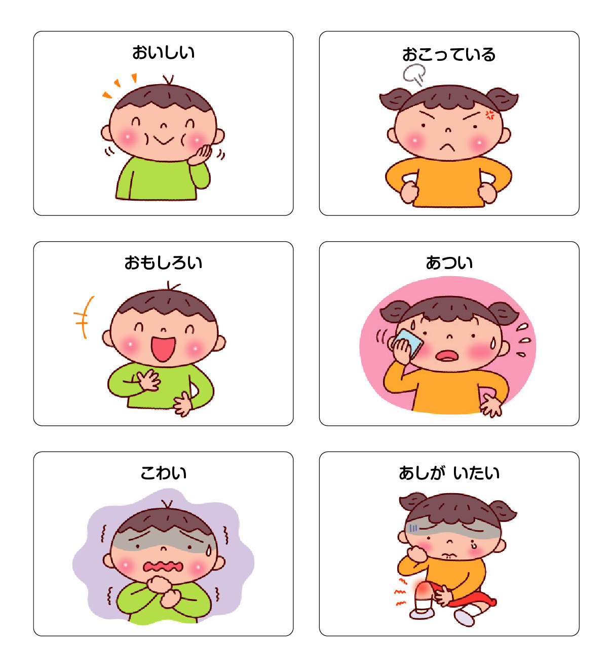 | 「うれしい」「かなしい」などの〝気持ち〟を表す絵カードを取り札にして、かるたをしましょう。楽しくあそびながら、自分や友だちの〝気持ち〟に対する関心を無理なく高められます。 | |