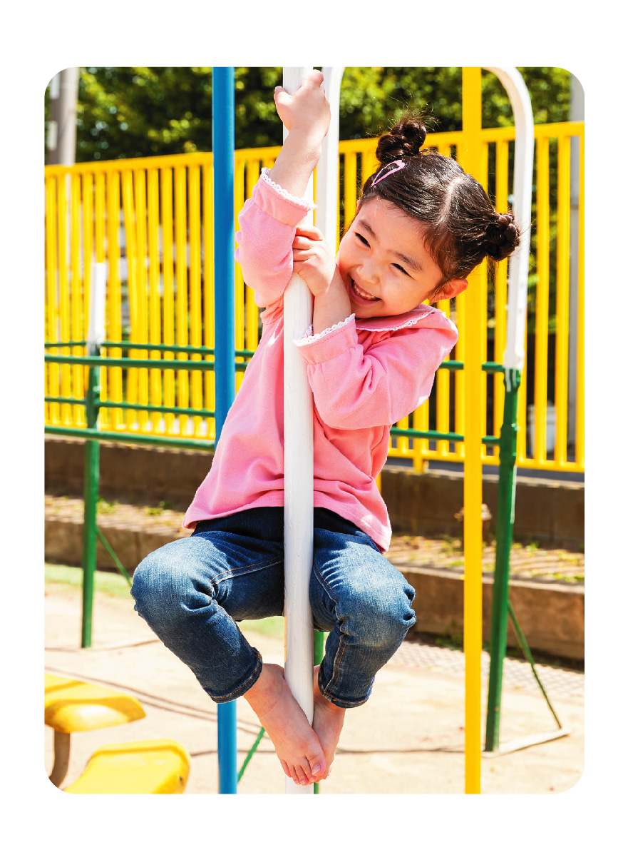 | (あそび方)4歳〜 登り棒にしっかり手足を絡ませてしがみつき、姿勢をキープ。おさるさんになりきって、アゴをひいて手足を曲げる屈曲姿勢を、30秒以上保持します。 |