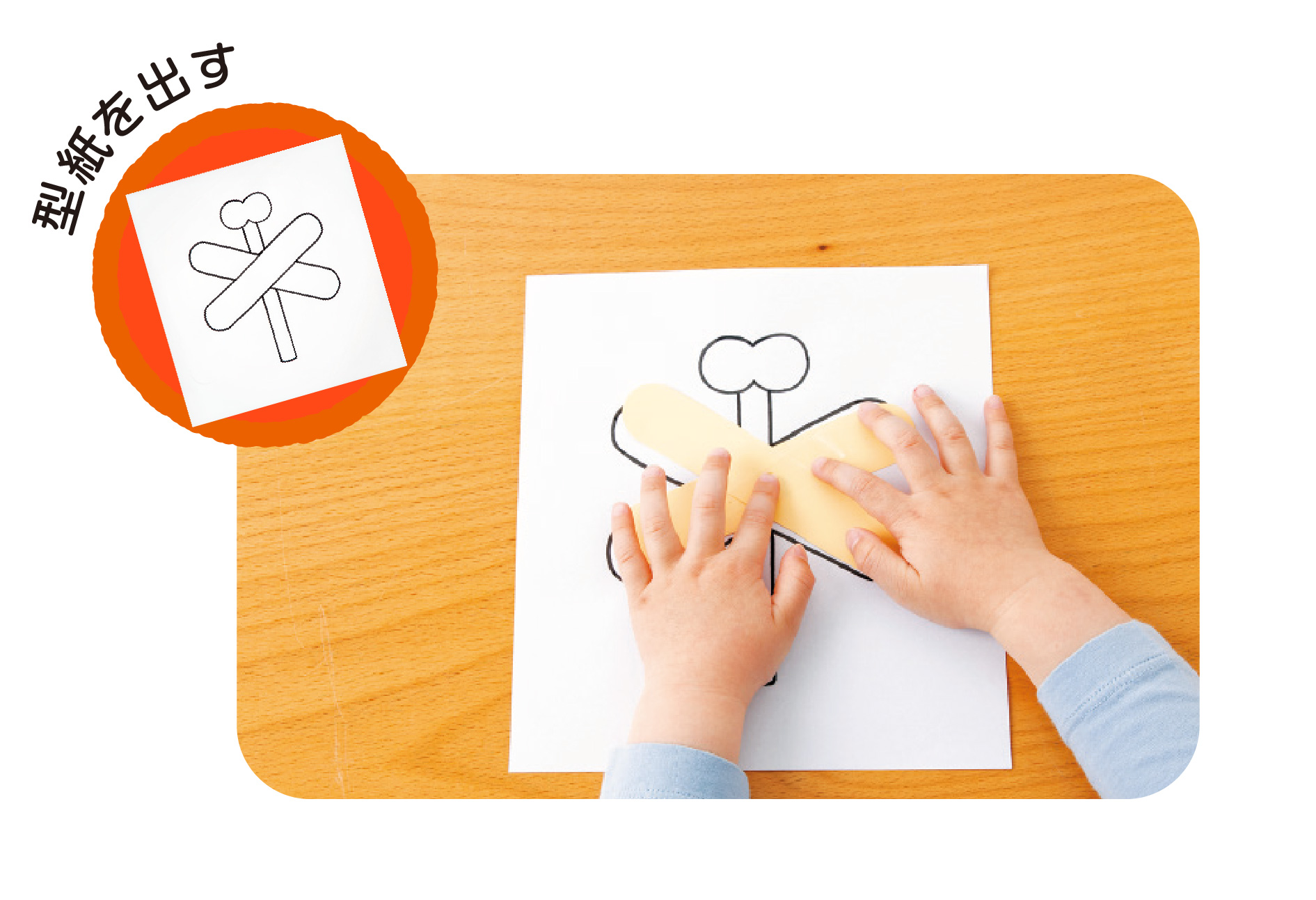 | 3.羽を貼り合わせる 重ね方の目安がわかるように、型紙の上に羽を斜めに重ねて置き、セロハンテープで貼る。2歳児は保育者が行う。 |