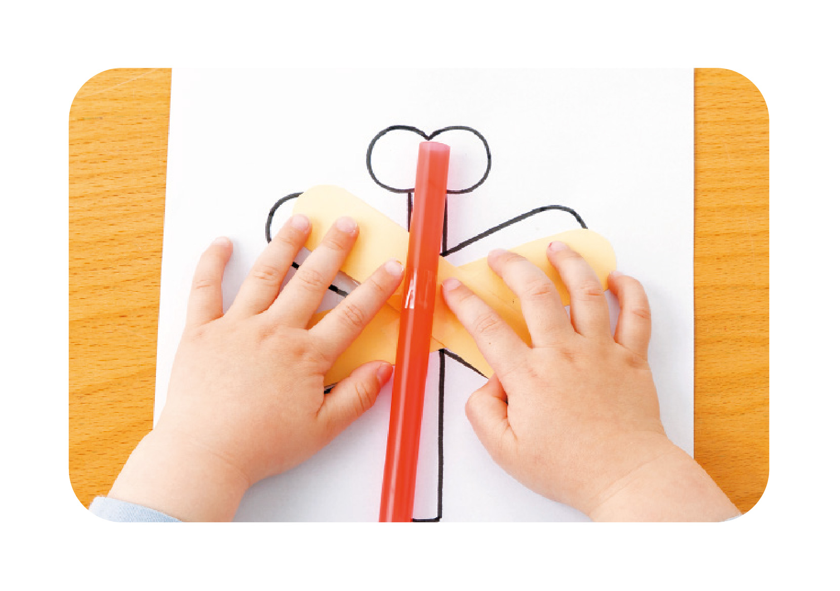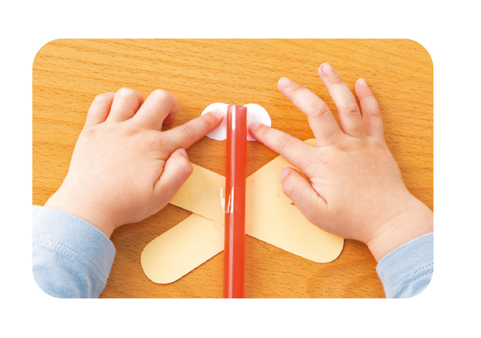 | 4.羽にストローを貼る 羽の上にストローを置き、セロハンテープで貼る。2歳児はストローを段ボールなどに変えても。 |