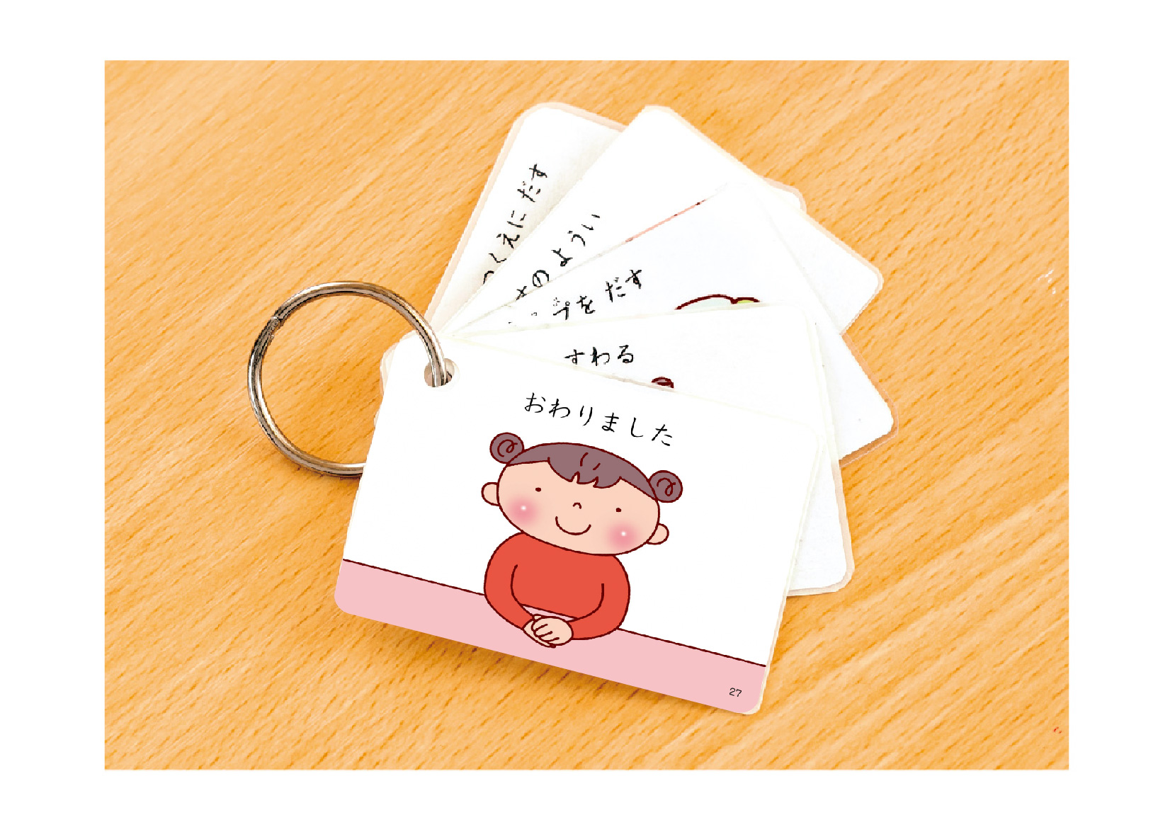 複数の絵カードをリングで束ねれば、ポケットに入れて携帯でき、必要なときにすぐ取り出して使えます。
