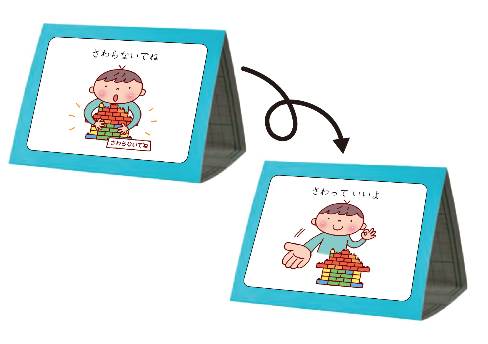 「さわらないでね」「さわっていいよ」といった意思表示の絵カードを、三角に作った立体の2面に1枚づつ貼ります。積み木であそんでいて、友だちが見に来ても、さわってほしくないときは、「さわらないでね」の面を見えるようにして置きます。さわってもよくなったら、立体を転がして「さわっていいよ」の面を見せます。
