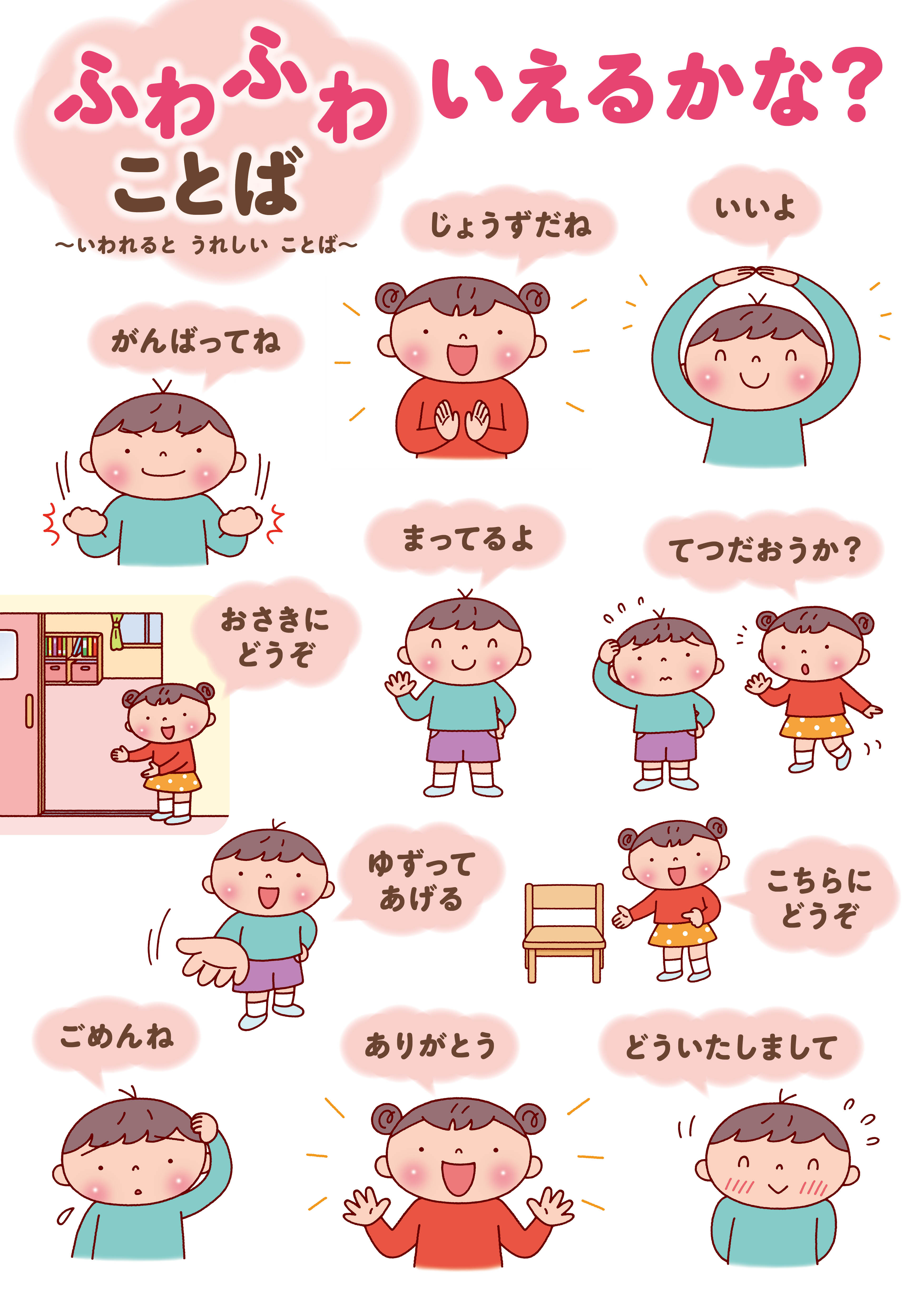 「ふわふわことば」をポスターにしました。部屋や廊下など、子どもの目につく場所に貼っておくのに便利です。