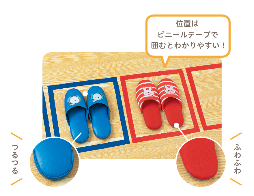 スリッパがペタッと足の裏に触れる感触に違和感をもつ子も。肌触りの違うものを用意して、選べるようにするとよいでしょう。子どもが好きなイラストを貼って認識しやすく。