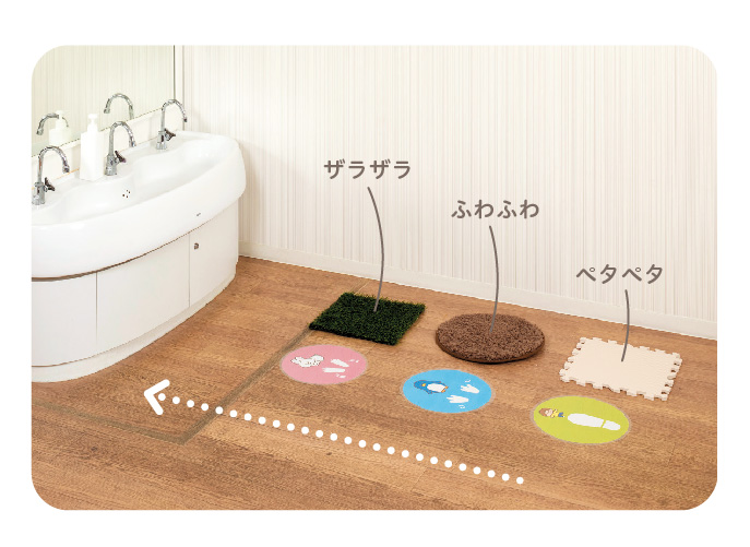 並ぶのが楽しくなる 手洗いプレイパーク イラストを貼ったりマットを敷いたりして、手洗い場をプレイパークに変身させます。待つことが苦手な子のために、並ばずに洗える「ファストパスレーン」も用意。 |