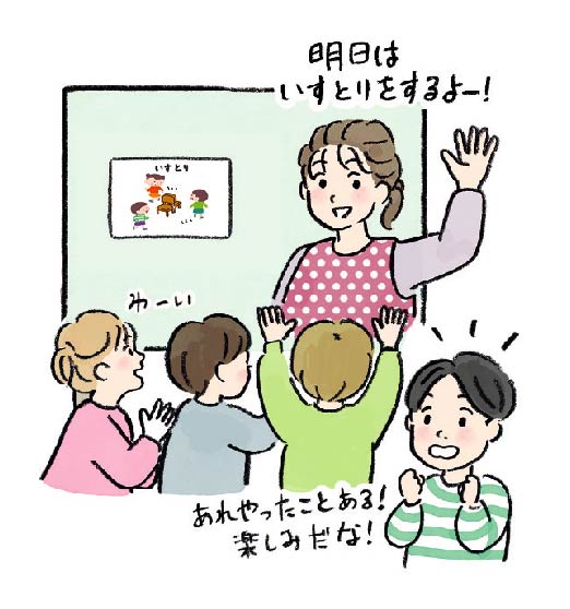 | 今日の楽しかった活動を絵カードを見ながら思い出せるように 「楽しいお知らせ」を聞いて、期待を膨らませることができたら、次は活動後に楽しかったことを振り返り、みんなでその楽しさを共有しましょう。ここでも活動を示す絵カードを提示しながら話すと、発達に課題のある子も「あのあそびの話か!」とわかり、活動を思い出しやすくなります。 |