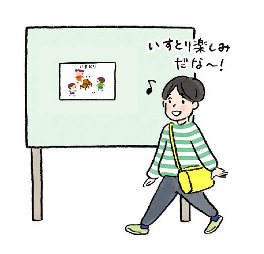 | 帰りの会で、明日の楽しい活動を絵カードで提示してみましょう 帰りの会で、子どもが好きな活動などを「お楽しみ」として知らせましょう。口頭だけでは伝わりにくく、忘れてしまうこともあるので、活動内容を示す絵カードも併せて提示します。翌朝まで貼っておくと、登園時、再度絵カードを見て、期待を膨らませることができます。 |