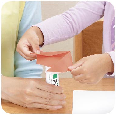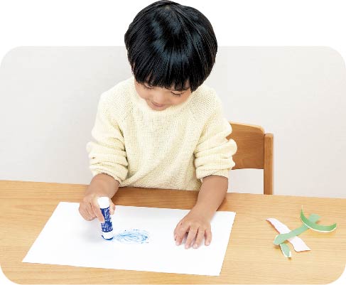 | 太めのスティックのりを立てて使っても 折り紙などを貼る場合には、太めのスティックのりを保育者が立て、子どもが紙をのせるようにのり付けしても。 |