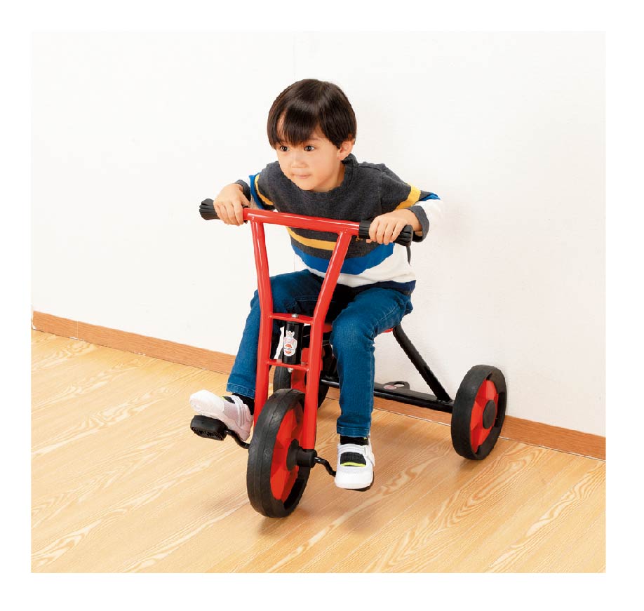 1. 動きのイメージをもつ ぬいぐるみのお客さん サドルにお気に入りのぬいぐるみを乗せて、落とさないように押します。三輪車のイメージを具体化でき、筋力も使います。 |