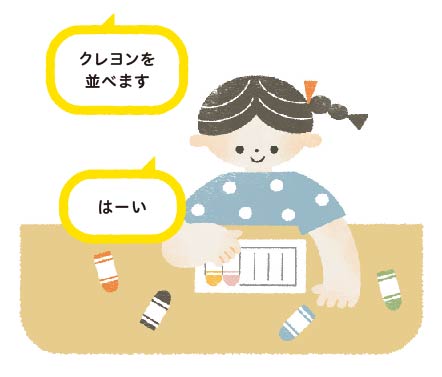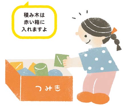 「片付けてね」では何をしてよいかあいまいなので、「赤い箱に入れてね」と伝え、できたらほめる。